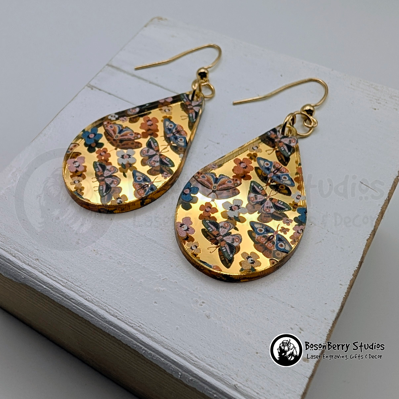 Our Butterflies & Moths Gold-Mirrored earring designs are simple to let the pattern ✨SHINE✨. While they'd be great gifts for Christmas, Mothers Day, or just because, these earrings can sparkle as part of your wardrobe year-round. Great for lovers of butterflies, florals, gold, and beautiful things! There are two elegant designs to chose from, perfect for any occasion.